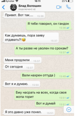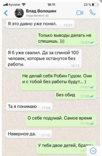 Далее из переписки видно, что Владислав Волошин хотел написать заявление на увольнение, но губернатор продлил ему контракт. "Я бы уже свалил. Но за спиной 100 человек, которые останутся без работы" – написал Волошин.