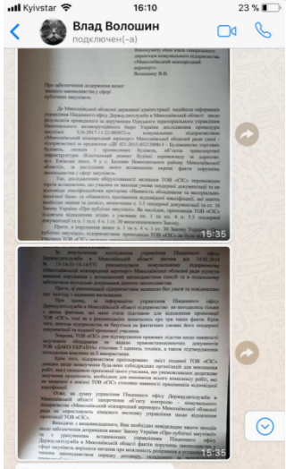 Далее он поделился копиями поручений главы Николаевской ОГА Алексея Савченко, а также копией выводов проверки Госаудитслужбы по поводу ремонтных работ в аэропорту.