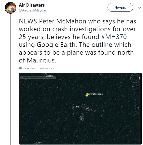 Австралийский любитель Питер Макмэхон провел собственное расследование исчезновения малайзийского пассажирского самолета, который пропал 8 марта 2014 года, и заявил, что ему удалось обнаружить обломки лайнера в океане.