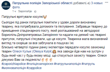 Патрульные полицейские Запорожской области пришли на помощь истощенной косуле, которая блуждала вдоль дороги. По всей видимости, животное нуждалось в помощи и заботе. Об этом сообщает пресс-служба полиции в Facebook.