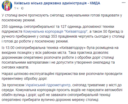 Из-за надвигающегося на столицу снегопада, в Киеве дежурят 255 единиц снегоуборочной и 127 единиц вспомогательной техники предприятий коммунальной корпорации "Киевавтодор", а также 50 бригад по ручной уборке в составе 353 работников. Коммунальщики готовы к работе в усиленном режиме. Об этом сообщает КГГА на своей странице в Facebook.