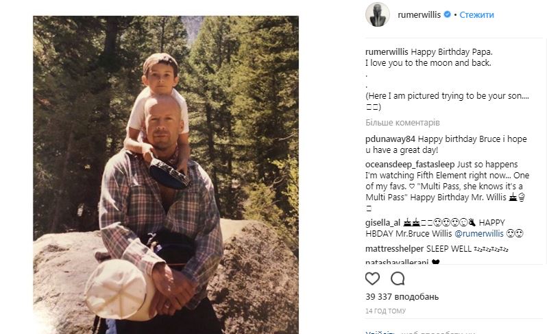 Румер, Скаут и Таллула в Instagram показав архивные фото с отцом."С днем рождения, папа. Люблю тебя до Луны и обратно. (На фото я пытаюсь быть твоим сыном)", - написала, в частности, Румер.