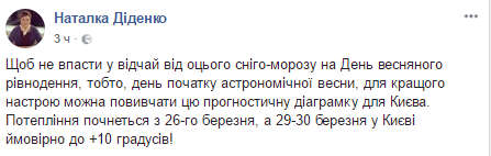 Синоптик Наталья Диденко показала прогностическую диаграмму для Киева, чтобы подбодрить тех, кто впал в отчаянье от снежного и морозного дня весеннего равноденствия.