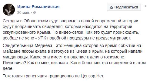 По ее данным, свидетельница по фамилии Медиева - это женщина которая во время событий на Майдане, якобы, ехала в автобусе из Киева в Крым, на который напали майдановцы. "Какое она имеет отношение к делу о госизмене Януковича? Как по мне, никакого. Как и большинство свидетелей в этом деле", - подчеркнула журналистка.