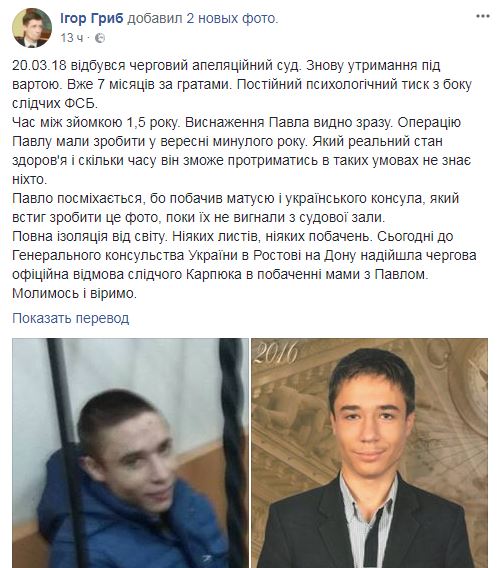 "Никаких писем, никаких свиданий. Сегодня в Генеральное консульство Украины в Ростове на Дону поступил очередной официальный отказ следователя Карпюка в свидании мамы с Павлом", - сообщил он.