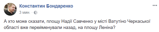 "А кто может сказать, площадь Надежды Савченко в городе Ватутино Черкасской области уже переименовали обратно на площадь Ленина?", - интересуется политолог Константин Бондаренко.