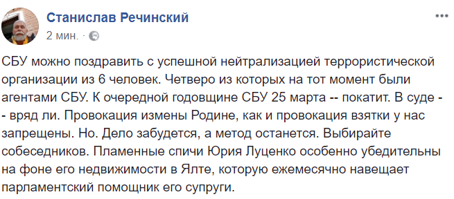 "СБУ можно поздравить с успешной нейтрализацией террористической организации из 6 человек. Четверо из которых на тот момент были агентами СБУ. К очередной годовщине СБУ 25 марта - покатит. В суде - вряд ли.