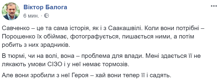 Народный депутат Виктор Балога пишет о том, как Савченко сначала делали героем, а теперь пытаются посадить: