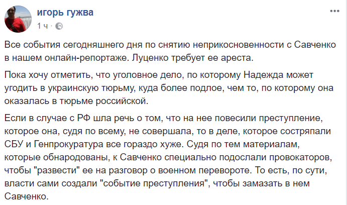 По итогу изучения документов принял решение голосовать за снятие с нее депутатской неприкосновенности и не буду голосовать за ее задержание и арест. Это моя личная позиция. Объясню почему: Во-первых, не хочу создавать для неё образ жертвы. Для меня она не жертва, а правонарушитель. А во-вторых, считаю правильным, чтобы Генеральный прокурор Юрий Луценко, вместо представления на арест Надежды Савченко, подал документы на согласие Верховной Рады на ее принудительное обследование в псих лечебнице".