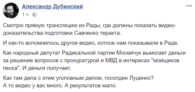 "Как народный депутат Радикальной партии Мосийчук вымогает деньги за решение вопросов с прокуратурой и МВД в интересах "мойщиков песка". И деньги получает. Как там дела с этим уголовным делом, господин Луценко? А то видео у вас много. А результатов мало".