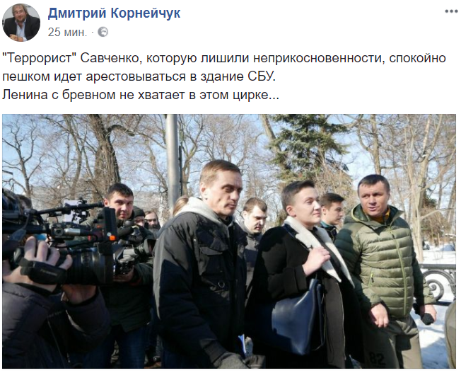 "Террорист" Савченко, которую лишили неприкосновенности, спокойно пешком идет арестовываться в здание СБУ. Ленина с бревном не хватает в этом цирке", - пишет политолог Дмитрий Корнейчук.