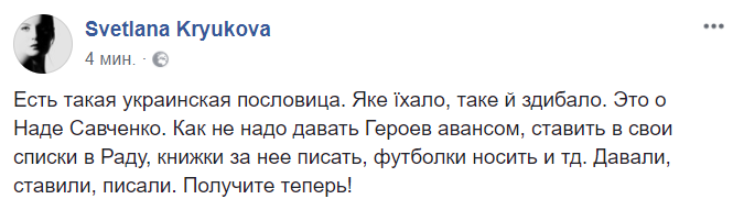 "Есть такая украинская пословица. Яке їхало, таке й здибало. Это о Наде Савченко. Как не надо давать Героев авансом, ставить в свои списки в Раду, книжки за нее писать, футболки носить и тд. Давали, ставили, писали. Получите теперь!", - пишет в Facebook журналист Светлана Крюкова.