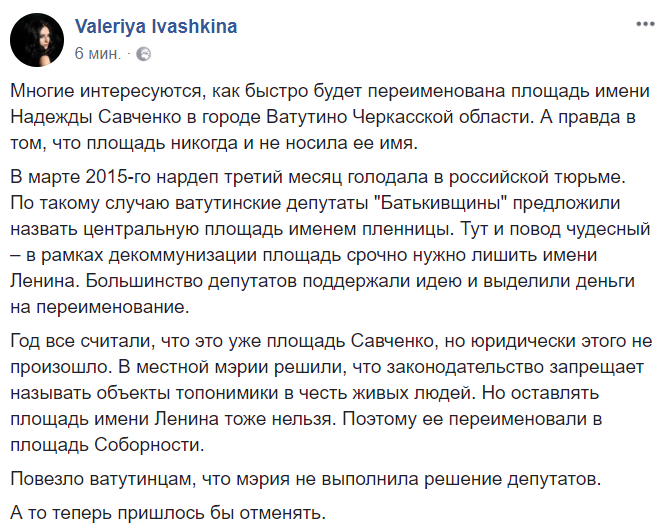 "Многие интересуются, как быстро будет переименована площадь имени Надежды Савченко в городе Ватутино Черкасской области. А правда в том, что площадь никогда и не носила ее имя.