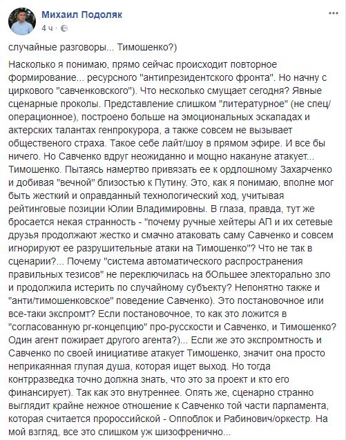 Политконсультант Михаил Подоляк рассуждает о связи происходящего с Тимошенко: "Савченко вдруг неожиданно и мощно накануне атакует... Тимошенко. Пытаясь намертво привязать ее к ордлошному Захарченко и добивая "вечной" близостью к Путину. Это, как я понимаю, вполне мог быть жесткий и оправданный технологический ход, учитывая рейтинговые позиции Юлии Владимировны.