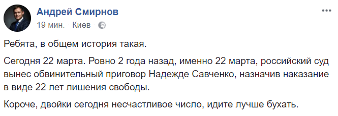 Юрист Андрей Смирнов вспомнил, что российский суд осудил Савченко ровно 2 года назад - 22 марта 2016 года, и приговорил ее км заключения 22 года.