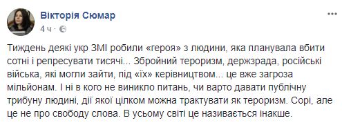 Глава комитета ВР по вопросам свободы слова и информационной политики Виктория Сюмар: " Неделю некоторые укр СМИ делали "героя" из человека, который планировал убить сотни и репрессировать тысячи ... Вооруженный терроризм, госизмена, российские войска, которые могли зайти, под "их" руководством ... это уже угроза миллионам. И ни у кого не возникло вопросов, стоит ли давать публичную трибуну человеку, действия которой вполне можно трактовать как терроризм. Сорри, но это не о свободе слова. Во всем мире это называется иначе".