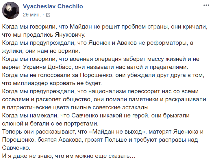 Журналист Вячеслав Чечило пишет о тех, кто называл Савченко героем, а теперь отвернулся от нее: "Когда мы говорили, что Майдан не решит проблем страны, они кричали, что мы продались Януковичу.