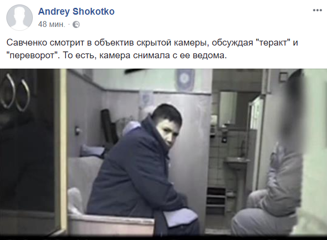 Журналист Андрей Шокотко обращает внимание на то, что Савченко смотрит в объектив скрытой камеры, обсуждая "теракт" и "переворот". "То есть, камера снимала с ее ведома", - делает он вывод.