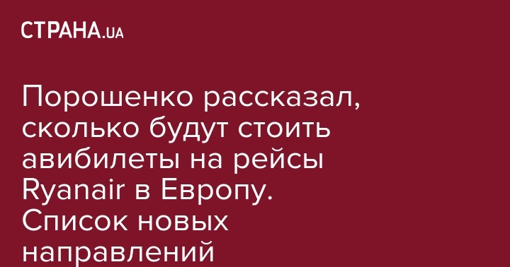 Порошенко рассказал, сколько будут стоить авибилеты на рейсы Ryanair в Европу. Список новых направлений