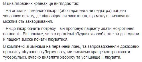 "Это 11 человек каждый день. При том, что государство закупает необходимые лекарства", – подчеркнула и.о. министра. В своем сообщении она описала, как проходит диагностирование туберкулеза в "цивилизованных странах".
