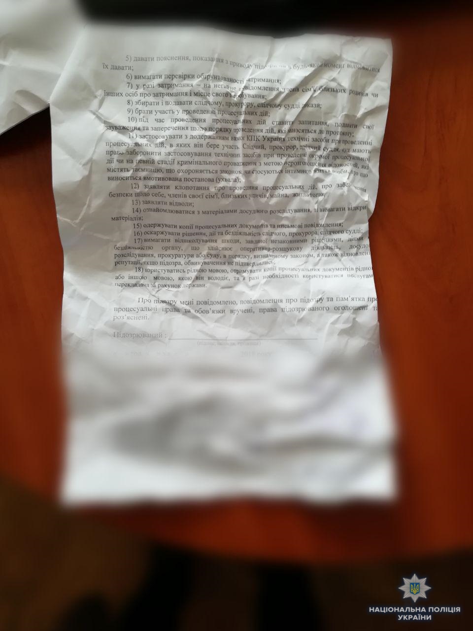 Для документирования правонарушения правоохранители вызвали группу реагирования патрульной полиции Белоцерковского отдела полиции и продолжили следственные действия. В этот момент мужчина выхватил из рук следователя процессуальные документы и пытался с ними убежать.