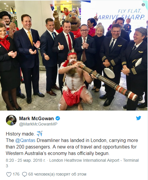 Премьер штата Западная Австралия Марк Макгоуэн написал в "Твиттере" после приземления самолета в Лондоне: "Новая эра путешествий и возможностей для экономики Западной Австралии официально началась".