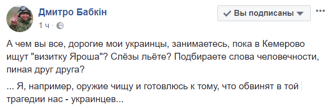 "А чем вы все, дорогие мои украинцы, занимаетесь, пока в Кемерово ищут "визитку Яроша"? Слезы льете? Подбираете слова человечности, пиная друг друга?
