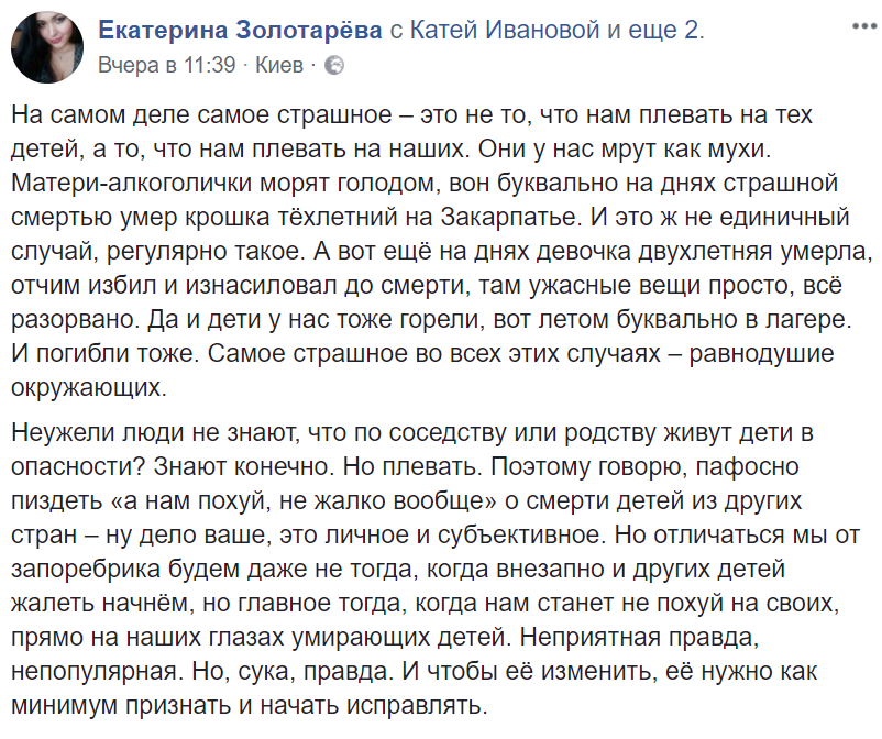 "На самом деле самое страшное – это не то, что нам плевать на тех детей, а то, что нам плевать на наших. Они у нас мрут как мухи. Матери-алкоголички морят голодом, вон буквально на днях страшной смертью умер крошка трехлетний на Закарпатье. И это ж не единичный случай, регулярно такое. А вот еще на днях девочка двухлетняя умерла, отчим избил и изнасиловал до смерти, там ужасные вещи просто, все разорвано. Да и дети у нас тоже горели, вот летом буквально в лагере. И погибли тоже. Самое страшное во всех этих случаях – равнодушие окружающих", – пишет она.