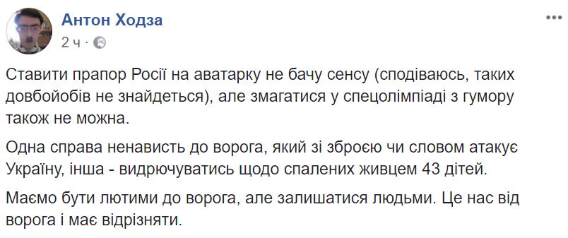 Одно дело ненависть к врагу, который с оружием или словом атакует Украину, другое – выдрючиваться в отношении сожженных живьем 43 детей", – упрекает соратников Антон Ходза.