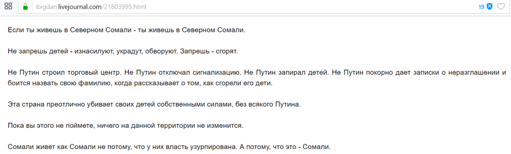 "Но отсутствие эмпатии – это равнодушие или просто отсутствие ощущения сродства. Это не хоп-хей-ла-ла-лей всякий раз, когда у супостата детсад обвалится. Это когда для вас новость о пожаре в Кемерово значит примерно как новость о пожаре в Гонолулу.