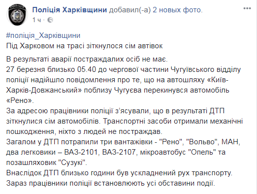 "В дежурную часть Чугуевского отдела полиции поступило сообщение о том, что на автодороге перевернулся автомобиль Renault. По адресу сотрудники полиции выяснили, что в результате ДТП столкнулись семь автомобилей. Транспортные средства получили механические повреждения, никто из людей не пострадал", – говорится в опубликованном сообщении.