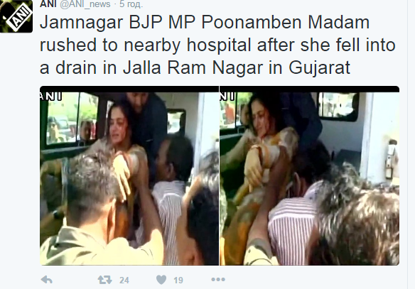Инцидент произошел в городе Джалла Рамнагар, штат Гуджарат, когда депутат общалась с местными журналистами. Она рухнула в канализацию.