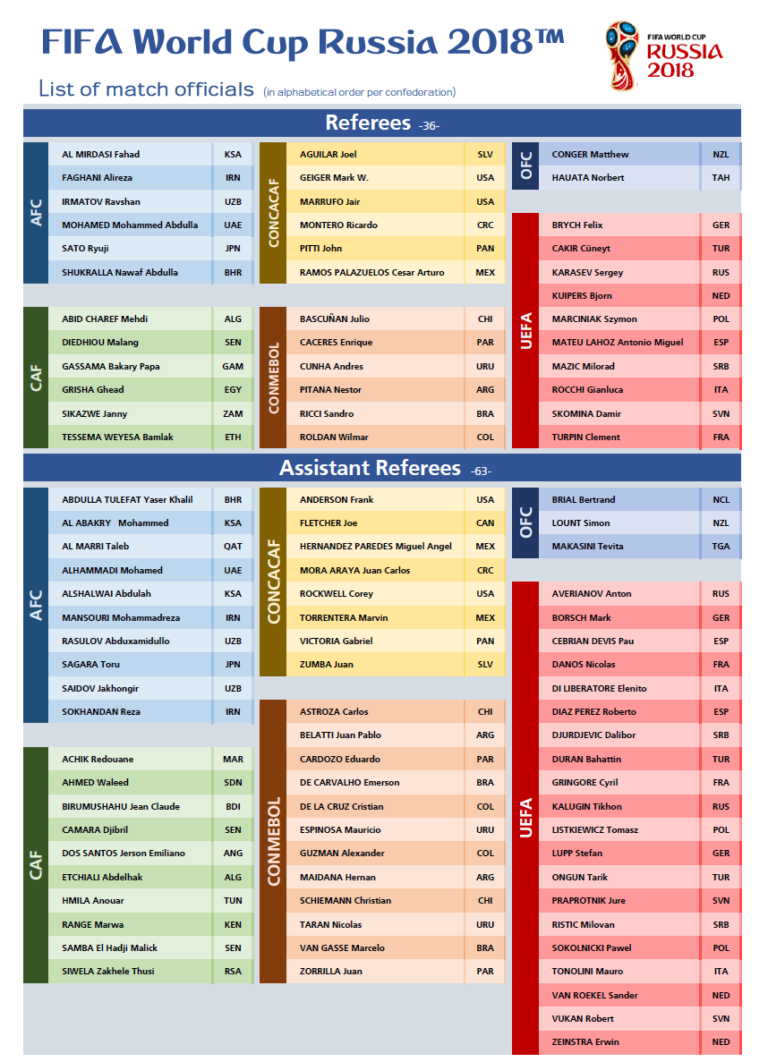 В ФИФА выбрали 36 арбитров и 63 ассистентов рефери, которым поручат судейскую работу на матчах чемпионата мира-2018 по футболу в России.