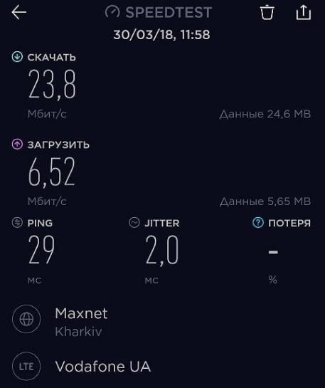 Скриншот проверки скорости по Харькову (оператор "Водафон").