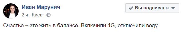 "Счастье – это жить в балансе. Включили 4G, отключили воду", - пишет киевлянин Иван Марунич.