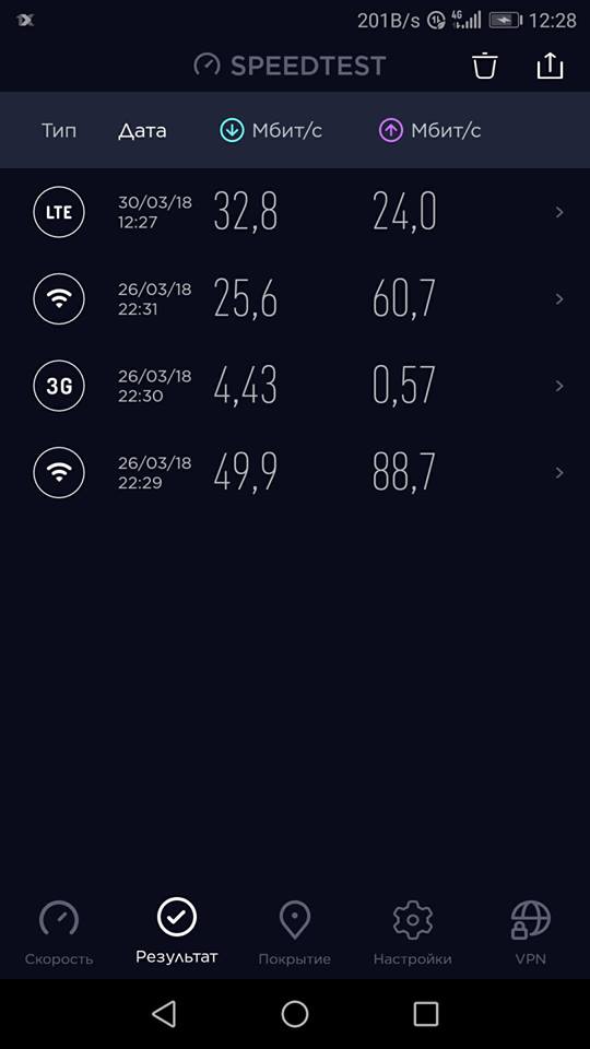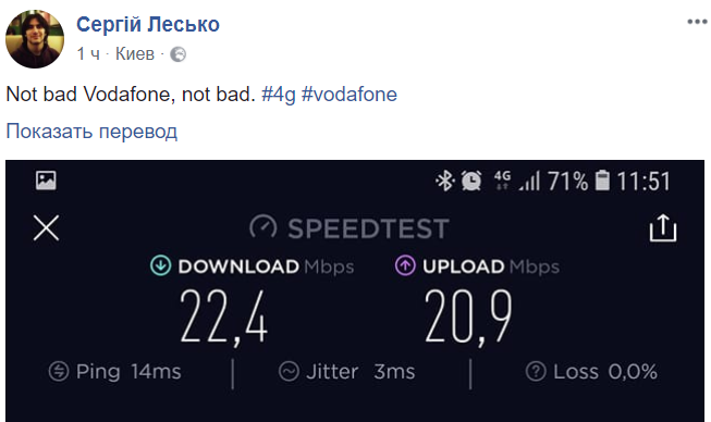 Киевлянин Сергей Лесько опубликовал результаты проверки скорости нового интернета на "Водафоне" - он работает в пределах 20 М/бит в секунду  - хотя должно быть больше. Но и это немало. Для сравнения: в центре Киева на Печерске стандартный 3G дает от 1 до 3 М/бит.