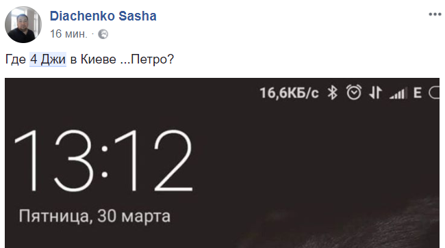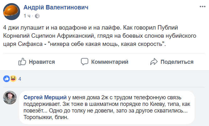"У меня дома 2ж с трудом телефонную связь поддерживает. Зж тоже в шахматном порядке по Киеву, типа, как повезёт... Одно до толку не довели, зато за другое схватились... Торопыжки, блин", - пишет киевлянин Сергей Мерщий в ответ на восторженный комментарий о запуске 4G.