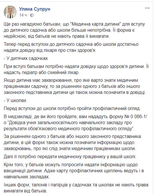 И.о. министра здравоохранения Ульяна Супрун заявила, что школы и детсады не имеют права требовать от родителей медицинскую карту ребенка для поступления. Об этом Супрун написала на своей странице в Facebook.