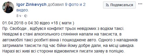 В ночь на воскресенье, 1 апреля, во Львове на проспекте Свободы произошел конфликт трех парней с водителем такси. Об этом на своей странице в Facebook сообщил депутат городского совета Игорь Зинкевич.