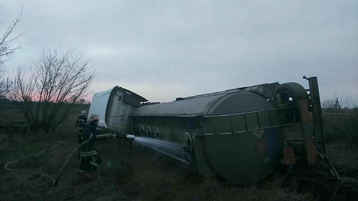 Под Запорожьем в кювет вылетела цистерна с топливом, бензин полился наружу. Фото