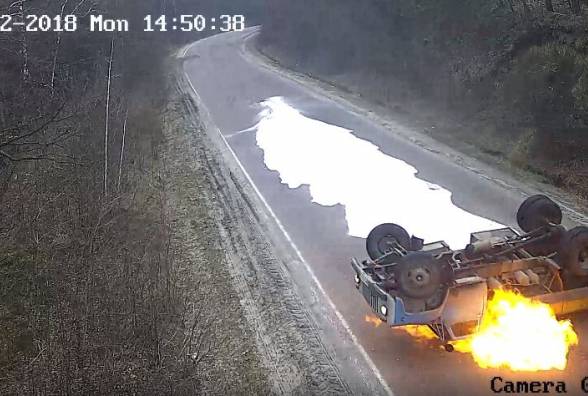 На видео зафиксировано, как водитель молоковоза на повороте обходил яму и не справился с управлением. Из опрокинутого молоковоза на дорогу разлилось молоко, машину протащило несколько метров по дороге и она загорелась.
