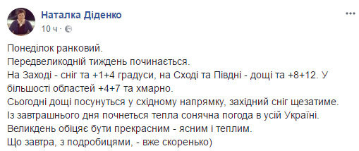 "Предпасхальная неделя начинается. На Западе - снег и +1 +4 градуса, на востоке и юге - дожди и +8 +12. В большинстве областей +4 +7 и облачно. Сегодня дожди подвинутся в восточном направлении, снег исчезнет. С завтрашнего дня начнется теплая солнечная погода по всей Украине. Пасха обещает быть прекрасно - ясным и теплым", - написала она.