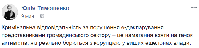 "Уголовная ответственность за нарушение е-декларирования представителями гражданского сектора - это попытка взять на крючок активистов, которые реально борются с коррупцией в высших эшелонах власти", - так сформулировала свое видение процесса глава фракции "Батькивщины" Юлия Тимошенко.