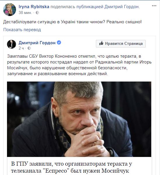 Об этом Ирина Рыбицкая написала на своей странице в Facebook.