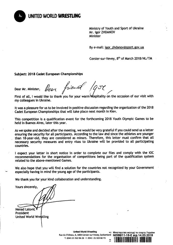 “На всех встречах высокого уровня руководству UWW отмечалось, что во время подготовки к соревнованиям правительством будут созданы условия, гарантирующие безопасность и уважение к каждому спортсмену в полном соответствии с международными правилами и действующим законодательством Украины. Однако отдельно было отмечено, что спортсмены, которые незаконно находились на оккупированных территориях Украины — в Крыму, отдельных районах Донецкой и Луганской областей, к соревнованиям допущены не будут”, - отметил Жданов.