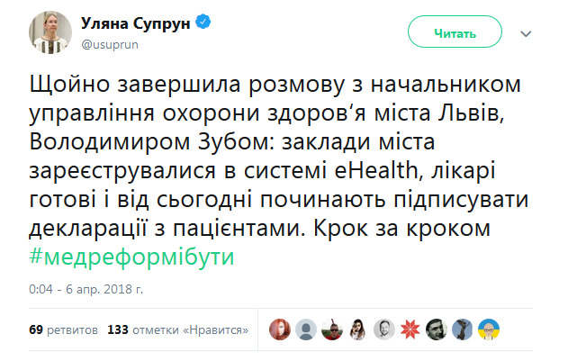 "Только что завершила разговор с начальником управления здравоохранения города Львов, Владимиром Зубом: учреждения города зарегистрировались в системе eHealth, врачи готовы и с сегодняшнего дня начинают подписывать декларации с пациентами", - написала Ульяна Супрун.