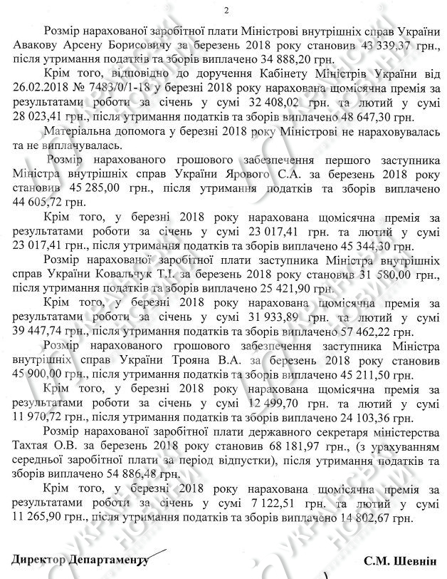 Зарплата министра внутренних дел Арсена Авакова за март составила 103,8 тыс. гривен, его заместителей - от 70,4 тыс. до 103 тыс. гривен, государственного секретаря министерства - 86,6 тыс. гривен.