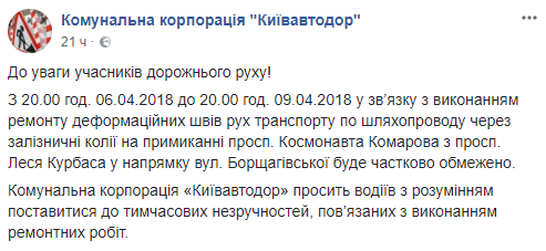 "С 20:00 6 апреля 2018 года до 20:00 9 апреля 2018 года, в связи с выполнением ремонта деформационных швов, движение транспорта по путепроводу через железнодорожные пути на примыкании просп. Космонавта Комарова с просп. Леся Курбаса в направлении ул. Борщаговской будет частично ограничено", - сообщили в Киевавтодор".