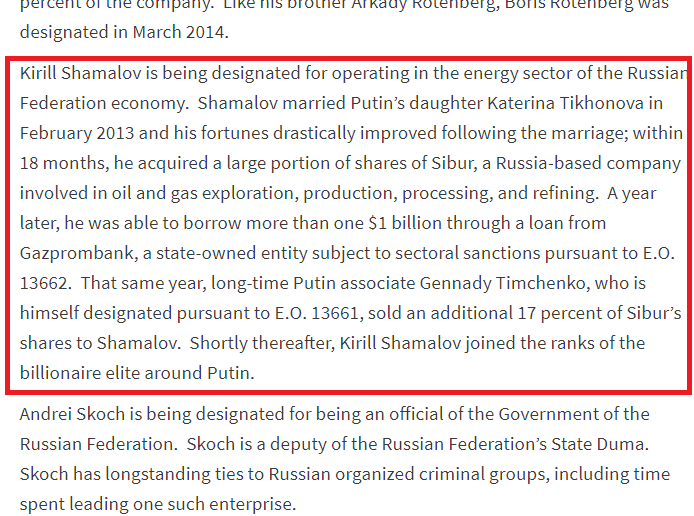"Шамалов женился на дочери Путина Катерине Тихоновой в феврале 2013 года и его состояние выросло в разы сразу после вступления в брак; всего за 18 месяцев он получил большую долю акций "Сибура" - российской компании, которая занимается разведкой, добычей и переработкой нефти и газа", - сказано в пояснительной записке.
