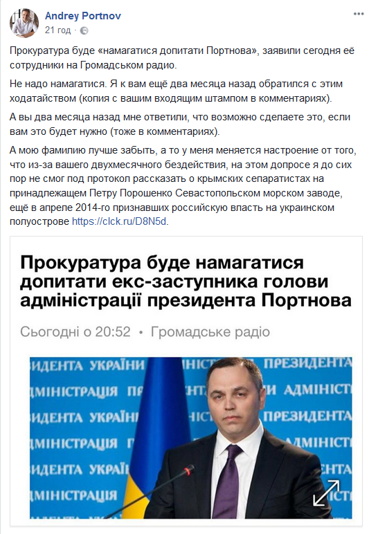 А мою фамилию лучше забыть, а то у меня меняется настроение от того, что из-за вашего двухмесячного бездействия, на этом допросе я до сих пор не смог под протокол рассказать о крымских сепаратистах на принадлежащем Петру Порошенко Севастопольском морском заводе, ещё в апреле 2014-го признавших российскую власть на украинском полуострове", - написал Андрей Портнов.